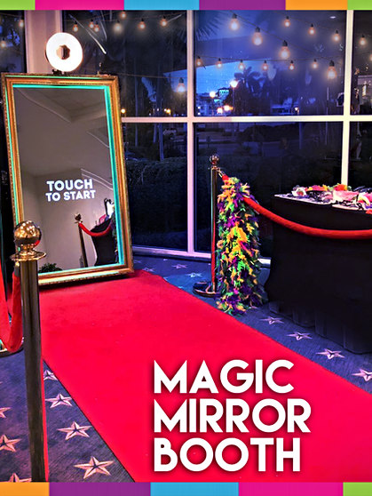 The Mirror Booth ULTIMATE Package includes 4 hours of unlimited photo sessions, *Unlimited 4x6 professional printed photo keepsakes, online digital gallery, interactive touch screen, custom picture layout, instant email or text capabilities of all pictures at event, props, on-site booth technician, *one social media kiosk, *custom step-&-repeat backdrop or a selection from the gallery, *quality red carpet and *gold stanchion posts w/red velvet ropes, *Keepsake Album w/ duplicate prints for guests to sign